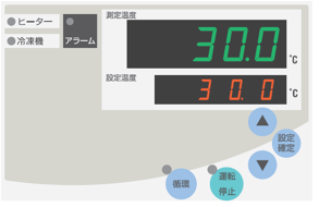 | 安全機能 | 温調器自己診断機能、冷凍機オーバーロード、センサ不良、冷凍機高圧スイッチ、冷凍機保護タイマ、循環ポンプサーマルプロテクター、凍結防止流量スイッチ、インバーターアラーム、漏電・過電流ブレーカ | |||