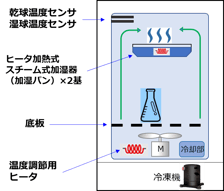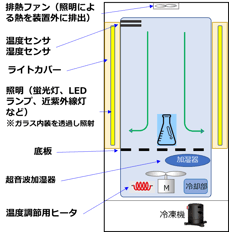 ヒータと冷却ユニットにより温度調節されます。温調された空気はファンにより庫内を循環。湿度は乾球用と湿球用温度センサにより測定されて、加湿器および冷却ユニットの除湿作用により湿度調節できます。